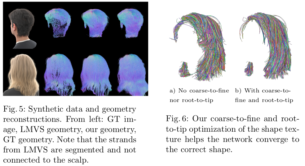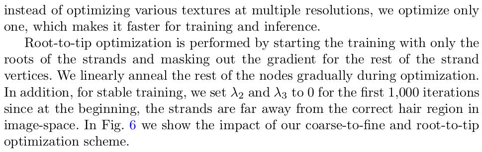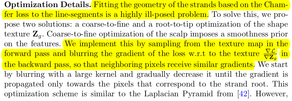 딱봐도 그래도 최적화 난이도가 쉽진 않아 보인다. chamfer distance라는게 아무랑 매치돼서 0으로 갈수도 있다 보니까 말이다. 그래서 안정적인 학습을 최대한 만들어내기 위해서 texture domain 상에서 인접한 애들끼리 loss gradient를 가지고 loss gradient를 한번 억제해준다. 다른 말로, 주변의 loss가 너무 나랑 다르면 너무 급변하는 것이니까 살짝 억제 주변의 loss가 나랑 고만고만하면 좀 적극적으로 업데이트 하는 식이다. 그리고 추가적으로 머리카락 시작부분의 vertex부터 차근차근 뻗어나가도록 학습하는 것이 도움된다고 한다. |