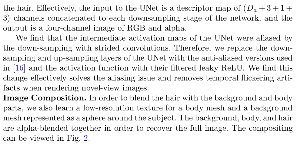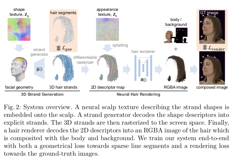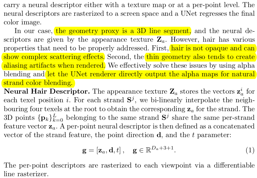 UV map으로 정의된 1) shape texture : hair strand를 표현하는 latent z가 각 texel에 저장되어 있음 2) appearance texture : hair의 색상이나 렌더링에 사용할 latent가 각 texel에 저장되어 있음 2개의 texture map을 learnable로 두고 시작한다. VAE형태로 strand (3D line)의 다양한 경우의 수를 학습 시켜둔 뒤 그 decoder를 가져와서 G()로 사용 -> 3D line은 꼭 hair 데이터셋이 없어도 만들 수 있기 때문에 VAE를 만들어두는게 가능 decode(strand latent z)로 만든 geometry에 descriptor를 입힌 뒤 (여기서 각 strand는 두피에서 무조건 시작하기 때문에 두피의 위치, 즉 texel을 가지고 ID를 부여할 수 있음) 렌더링 렌더링 GS나 다른 rasterizer쓴것 아니고, UNet의 image generator 같은 것이다. 다시 말해 descriptor로 이루어진 2d IMAGE를 REAL IMAGE로 바꿔주는 역할, 렌더러라고 불렀다. 최종적으로 입력 이미지랑 alpha compositing해서 최종 이미지 만들기 |
