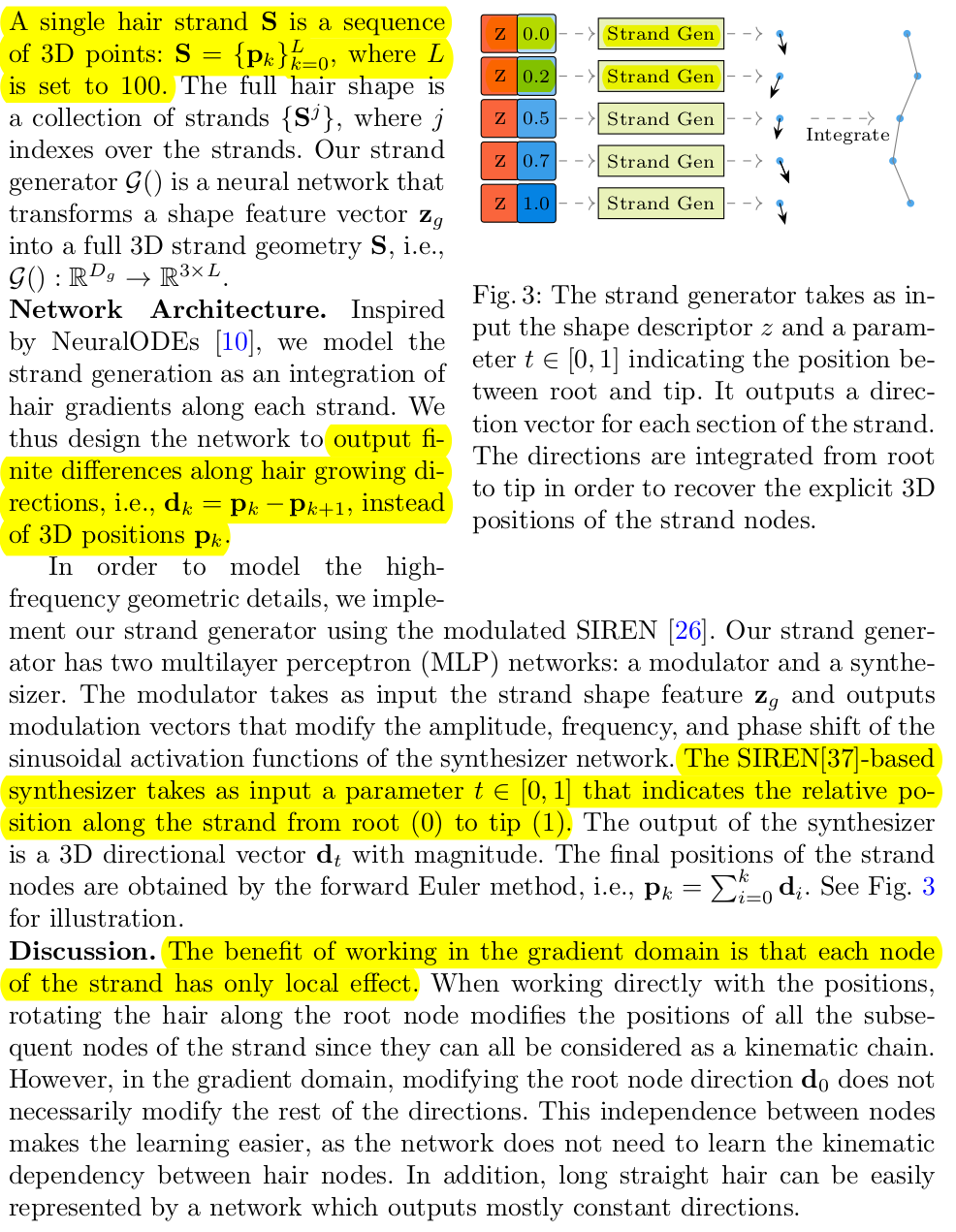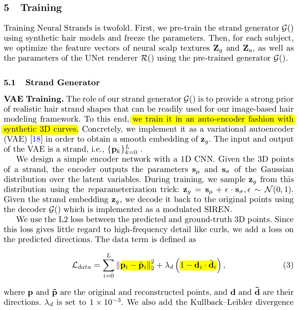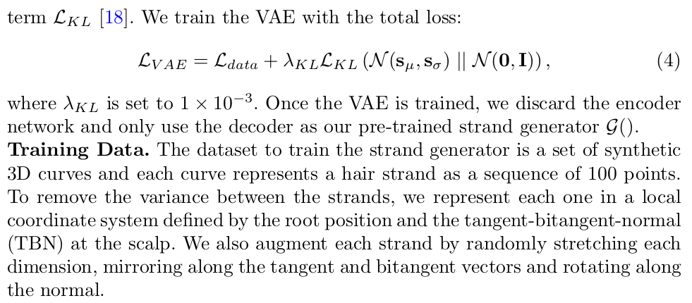 이 strand를 어떻게 정의했는가가 사실 핵심인데 굉장히 깔끔하고 쉽게 정의했다. 일단 strand는 여러개의 vertex의 집합으로 표현했다. 이 vertex가 일렬로 연결되면 머리카락이 되는 것. 직선의 집합인 것이다. ---- latent z가 있고, 추가로 0-1 범위의 t 값을 같이 decoder에 넣어준다. 그러면 해당 strand의 위치가 나온다. t값은 머리카락 시작 (두피점)과 끝점까지를 길이 1로 두었을 때 상대 위치를 표현한다. 예를 들어 z 0.1 을 decoding하면 머리카락 10% , z 0.2, ... 이런식으로 decoding한 뒤 연결하면 머리카락이 되는 것 z가 어떤 값이냐에 따라 길이나 방향 성이 달라진다. ------- 머리카락 1개당 100개의 vertex를 두었다고 한다. 그럼 t는 0.01 단위로 100개로 두었을 것 같다. ------ 하나의 팁은 vertex position을 직접 계산하게 되면 자유도가 너무 높고 이전 vertex 위치를 알아야만 네트워크가 계산하기 쉽다. 따라서 머리카락 후반부 일수록 이전 정보가 없어 정확도가 떨어질 수 있다. 이를 해결하기 위해 position을 얻어내는 목적을 똑같지만 각 vertex로 부터 relative direction + length를 예측하게 했다. 이렇게 하면 각 분절은 현 상태에서 어떻게 이동해야하는지만 예측하기 때문에 난이도가 낮아짐 논문에서 local effect라고 언급한 부분. |