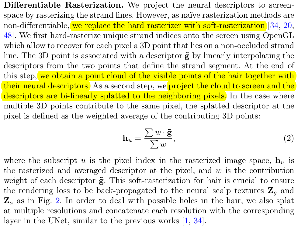 Rasterizer라고 표현했지만 사실 projection에 가깝다. 두께가 존재하지 않는 edge로 표현된 strand는 사실 rasterize될 수 없다. 따라서 지금 strand vertex를 이미지로 그냥 찍어서 점으로 표현된 걸 활용한다. 모든 strand vertex를 이미지로 내려찍은 뒤, 같은 pixel에 맺혔다면 겹친 애들끼리 weighted sum (weight는 구체적으로 어떻게 계산했는지 안나옴. pixel마다 descriptor를 채운다. |