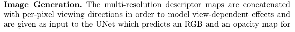 듬성 듬성 descriptor로 채워진 map을 Unet을 통과시켜 RGB +A로 예측 A를 이용해 입력 이미지와 overlay하면 렌더링 끝이다. |