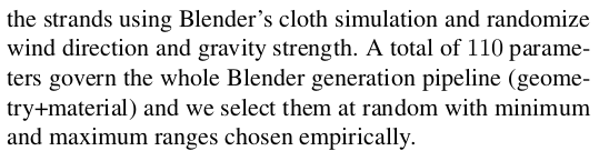 파이프라인 1) scalp UV texture (noise) 를 diffusion model에 입력 2) DINOv2 feature를 뽑아서 conditioning (sym2real gap 완화) 3) 3D strand decoding (from VAE) + interpolation 데이터 생성 1) blender에서 FLAME scalp region에 50여개 guide strand 생성 (수작업) 2) strand 복제 + 확산하도록 blender node 디자인 3) 데이터셋 4만개 생성 |