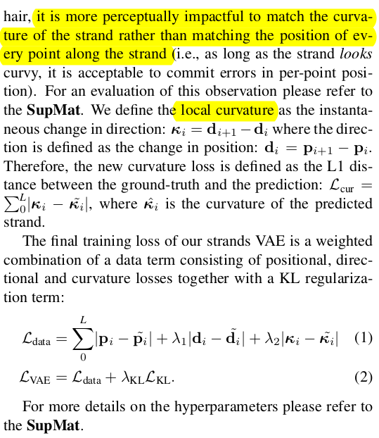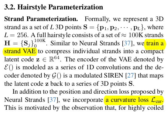Hair strand의 정의는 neural strand를 그대로 따라감. 100개의 point로 표현되는 1가닥 머리카락이 z 로 압축되고, 다시 원복되는 VAE를 기본으로 함. local curvature로 표현하는 것이 좋기 때문에 neural strand와 같이 100개의 local direction + magnitude 형식으로 예측하도록 설계 단 차이는 GT와 loss를 먹일 때 이전에는 그냥 값 차이를 직접 줄이는 식으로 했는데 이번엔 direction의 변화량 즉 어떻게 보면 gradient도 따라가도록 loss를 추가해줌 ![]() 그러면 조금 더 잘 따라간다고 suppl에 나와있음. |