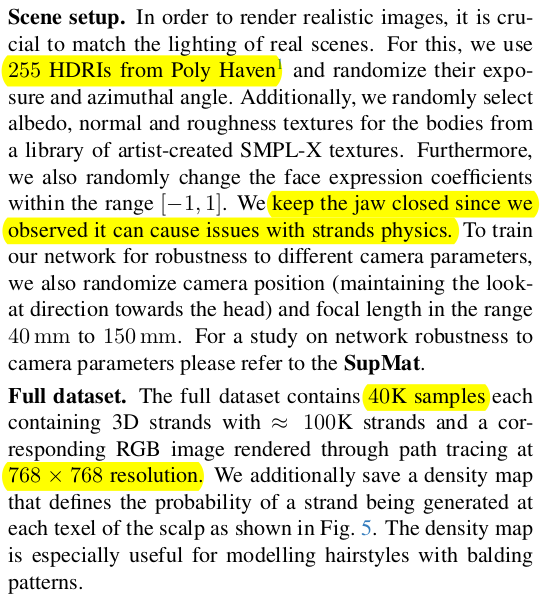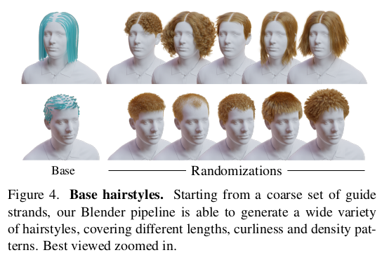 7) Poly Haven에서 synthetic environment 데이터를 구매해서 가상 환경을 구축하고 거기서 앞서 만든 hair style 모델을 다양한 아바타에 얹어서 렌더링 -> 헤어 <-> 이미지가 둘 다 존재하는 데이터셋 생성 -> synthetic이긴 하지만 최대한 realistic하게 만들었음 -> 추후에 DINOv2같은 걸 써서 완화하니까 큰 문제 안됨. |