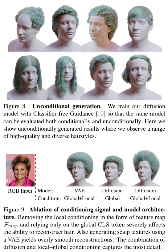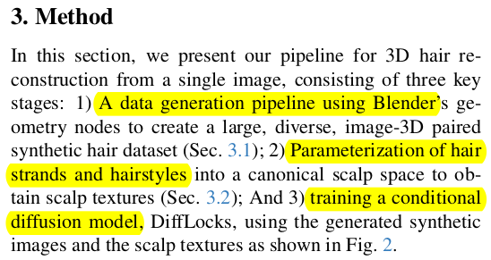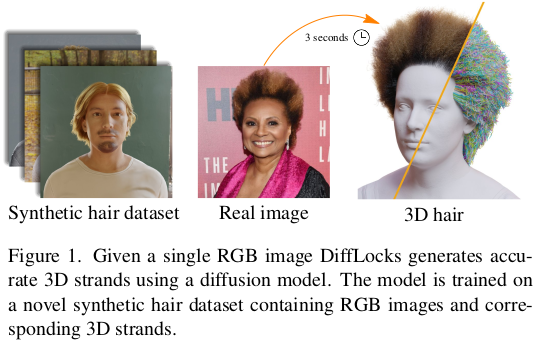 진짜 대박인 논문 하나 더 나왔다. Hair strand의 어떻게 보면 끝판왕이라고 볼 수 있는 형태가 나온 것 같다. 이미지 to hair style. 핵심은 Blender로 만든 대규모 synthetic hair dataset으로 image conditioned iffusion model을 학습시키는 것. 기반이 되는 아이디어는 Neural Strands에서 제안한 3D strand VAE (의 latent space), strand 정의 방법 자체다. 좋은 논문에 이은 좋은 후속작이라고 생각한다.