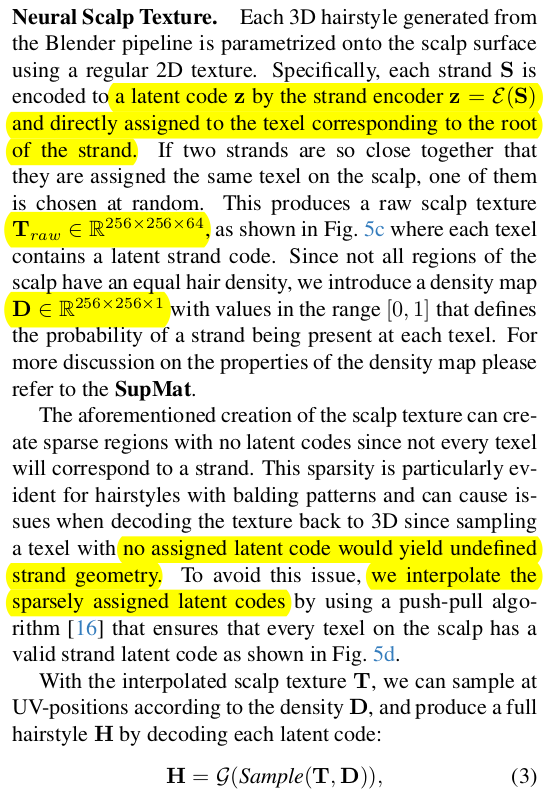 VAE가 학습이 완료된 이후에는 Neural strand와 같이 UV 도메인에서 시작한다. noise UV texture가 존재하고 이게 diffusion을 통해 이미지에 드러난 헤어스타일의 texture로 생성되도록 했음 데이터가 4만 샘플에서 나왔으니 수백만장도 가능했을 것이라 충분히 가능하다. ![]() 데이터를 100K로 촘촘하게 만들었지만 texel에 담아보면 빈 texel이 굉장히 많을 것. 근데 두피 상에서 이웃한 머리카락이면 비슷할 확률이 높기 때문에 이웃한 texel끼리 값이 비슷하다는 특성과도 맞아 떨어짐. 그래서 interpolation을 통해서 빈 texel은 채워준다. 다 채워버리면 noisy 해지니까 mask dilation/erosion으로 빈공간을 인식하고 확실하게 비어있도록 유지함. |