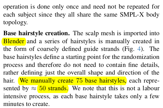 기존 데이터셋이 있기는 하지만 제일 중요한 이미지랑 매칭이 안된다. 그냥 hair 모델만 덩그러니 있어서 이미지랑 같이 풀 수가 없었음. ->그래서 새로 만들자 1) FLAME에서 수작업으로 513개 두피 vertex를 선별, 두피 영역을 mask를 따놓는 것 2) 두피 부분만 최대한 distortion없이 UV unwrapping (새로 정의함. 기존 FLAME UV unwrapping 사용 안했음) 3) blender에서 두피 vertex에 수작업으로 50여개 정도 strand 만듦 4) 3)을 75번 정도 반복해서 75개의 기본 헤어스타일을 만듦. ![]() |