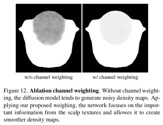 이 때 그냥 diffusion model만 사용하면 입력 이미지 정보에 맞는 헤어를 생성할 수가 없으니 condition으로 이미지가 들어간다. 단순히 이미지를 넣는 것은 아니고 DINOv2에서 뽑은 feature를 condition으로 넣는 전처리를 해줌 ->이게 sym2real gap을 폭발적으로 줄여줌. ---- 추가로 네트워크가 density map이라는 것도 같이 내뱉게 했는데 이건 두피 영역에서 머리카락의 존재 유무를 확률로 주는 것이다 diffusion model이 무조건 두피 전체에 hair strand latent를 생성할텐데 사실 사람마다 머리가 없는 영역은 다르다. 이제 대응하기 위해서 confidence 마스크처럼 사용할 수 있는 density map을 같이 생성함. |