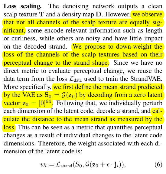 이건 실험적으로 발견한 내용을 loss에 다시 반영한 것인데, scale texture 즉 hair strand를 표현하는 latent가 64채널인데 모든 채널이 hair strand를 표현하는데 기여하진 않는다는 점을 발견했다. 당연하게도 dominant한 channel이 있을 것. 근데 학습 관점에서는 dominant channel에 sensitive하게 학습되긴 원할테니 channel 별 weight를 추가했다. ---- 그럼 어떤 channel이 영향력이 적은지 어떻게 찾느냐? VAE가 학습이 완료되어있으니 encoding을 한뒤 channel별로 하나씩 noise를 추가해봄 decoding했을 때 변화량이 크다면 해당 채널은 dominant 변화량이 작다면 trivial 채널이다. 이 짓을 엄청 많이 반복해서 오차들의 평균을 구해보면 channel weight를 구할 수 있음 이걸 loss 앞에 곱해주었다. |