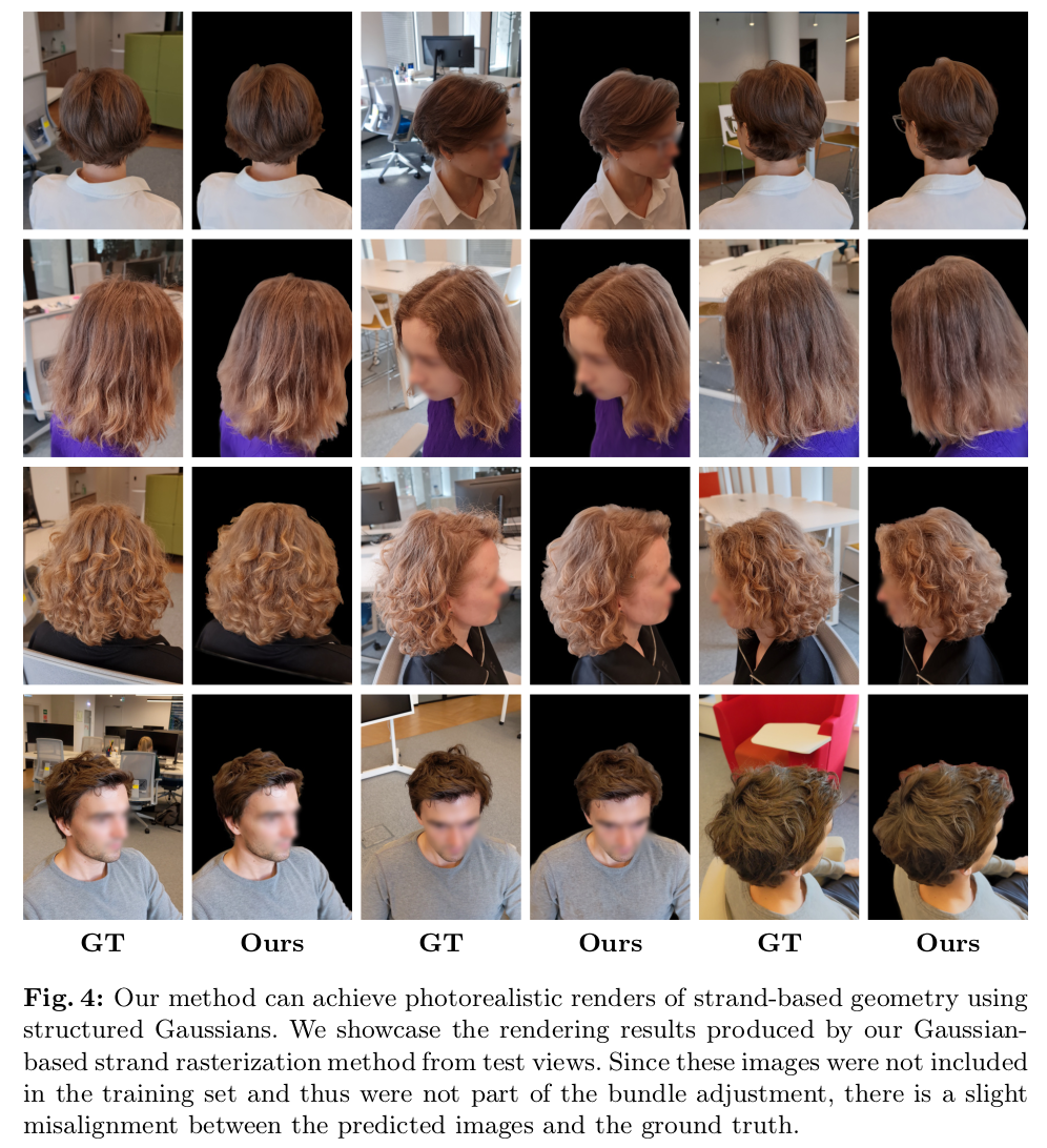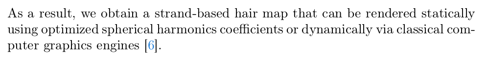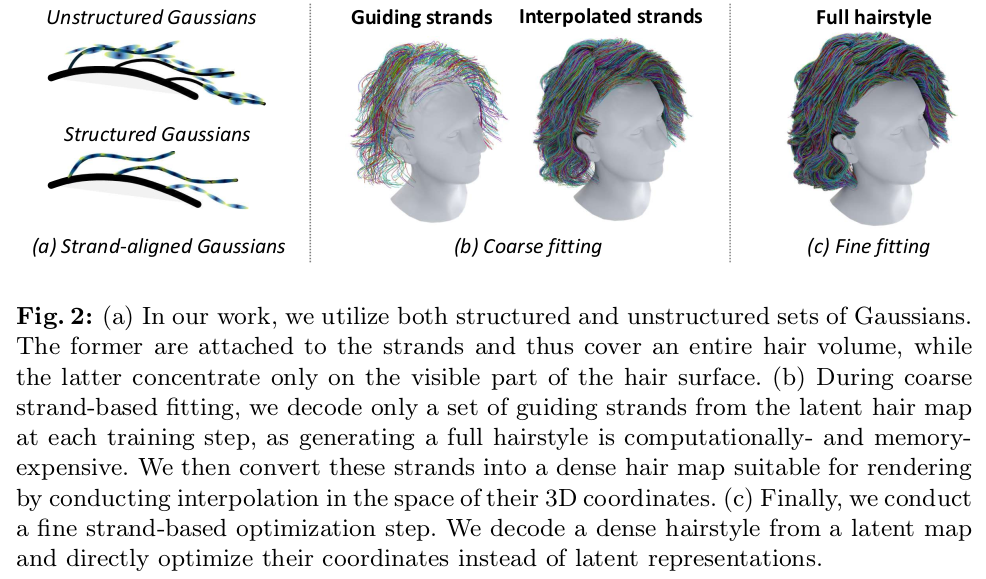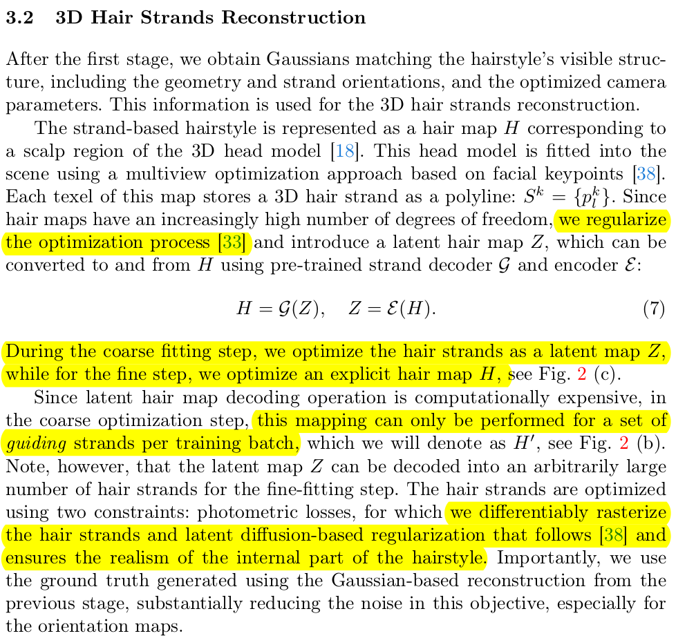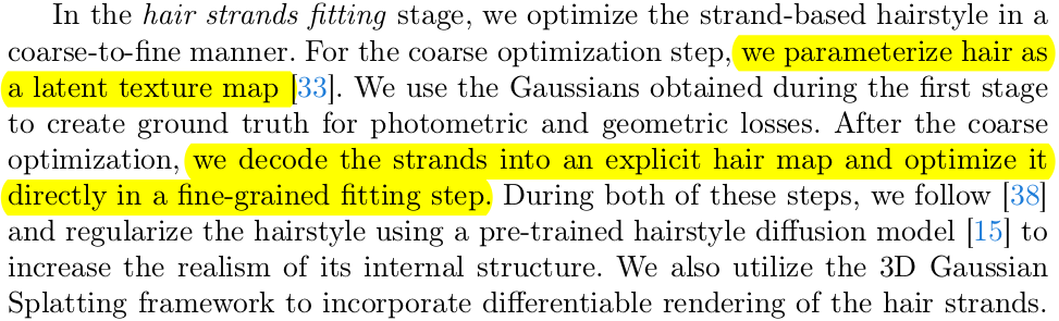 2) neural strands랑 똑같이, scalp texture에서 latent decoding해서 hair strand 생성 3) gaussian 할당 후 학습 -> 이 때 1)에서 만든 unstructured 3DGS로 렌더링한 무수히 많은 이미지를 죄다 사용했을 것으로 보임. |