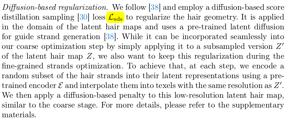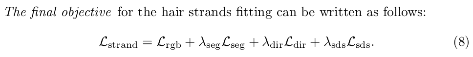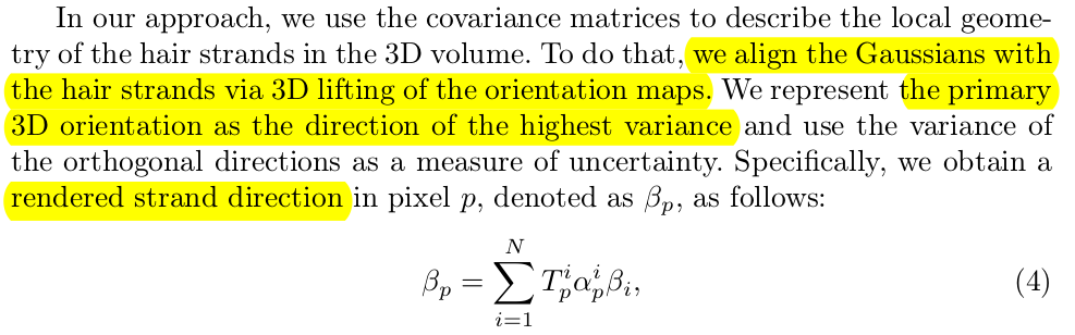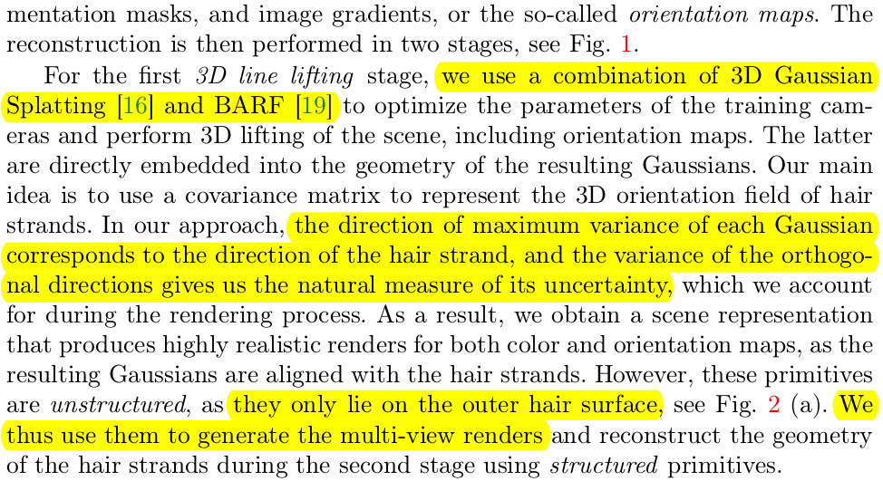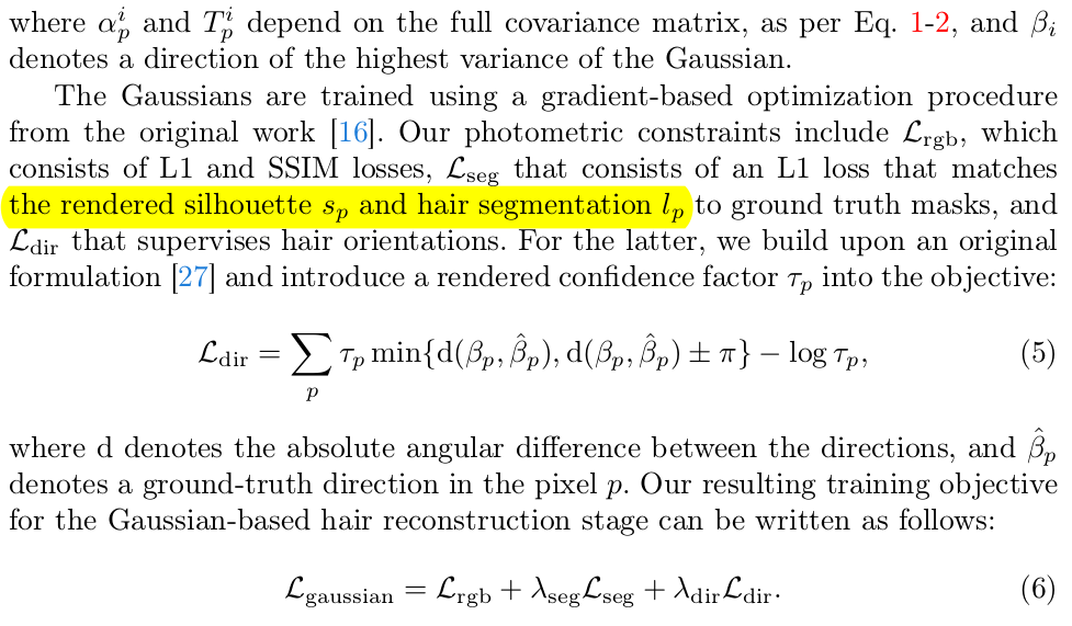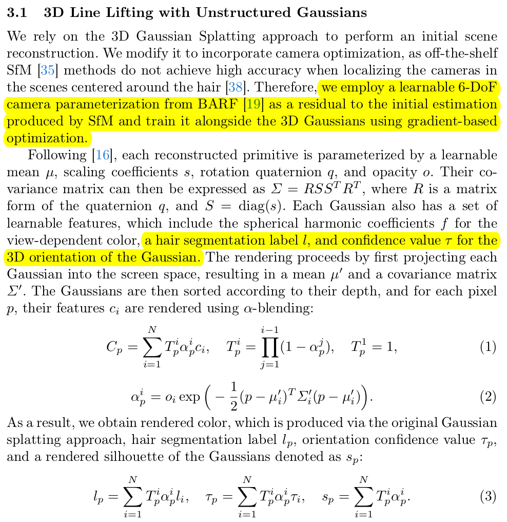 2) 3) 과정에 들어갈 디테일 설형 일단 초고퀄 복원이 기반이 되어야 머리카락이 잘 표현될 것이기 때문에 카메라 포즈가 엄청 정확해야 한다. 따라서 BARF 컨셉으로 unstructured 3DGS를 복원할 때 초기화도 빡세게 하고 카메라 포즈도 같이 업데이트했다고 한다. ->이게 BARF 차용했다고 언급만 할 간단한 구현 내용은 아닌 것 같은데 그냥 넘어간 듯 하다. 컨셉만 언급. 각 gaussian들은 hair segmentation label 즉, hairness 라고도 볼 수 있는 confidence를 추가로 갖고 있게 했고 머리카락 이다보니 뾰족해야 해서 뾰족한 모양이 맞는지 (그냥 렌더링 loss 줄이려고 추가되어 버린 앤지, 진짜 머리카락인지 분간) confidence도 추가했다. |