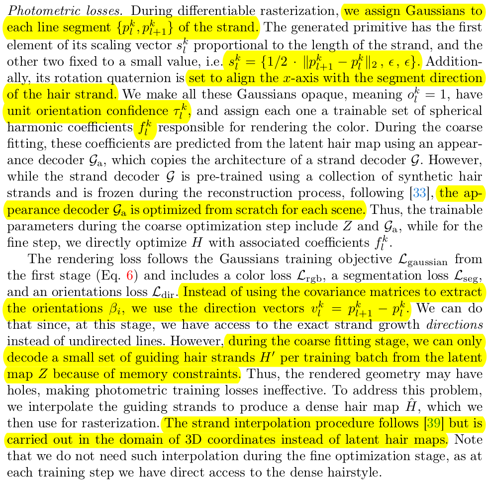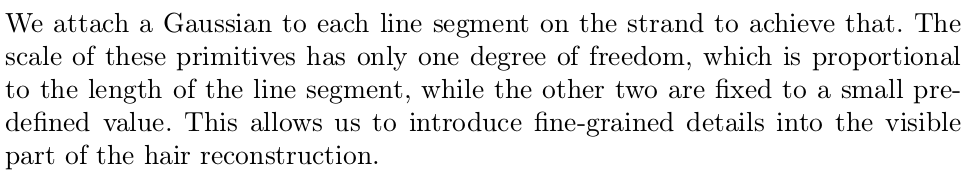 머리카락 1개에 존재하는 분절, line segment 마다 GS가 1개 존재하고 그 방향은 당연히 line segment 방향 (regularize가 아니고 아예 이렇게 고정했겠구나) 크기는 분절의 절반( 반지름이 절반이니 분절에 딱맞는 크기)로 초기화 했다고 함 opaity 1로 해주고 학습 appearance texture도 언급하는 걸보니, neural strand의 appearance texture deocoder도 가져왔나보다. 같이 학습. coarse 때는 guide strands만 fine 때는 interpolation 한 뒤, 전체 다. |