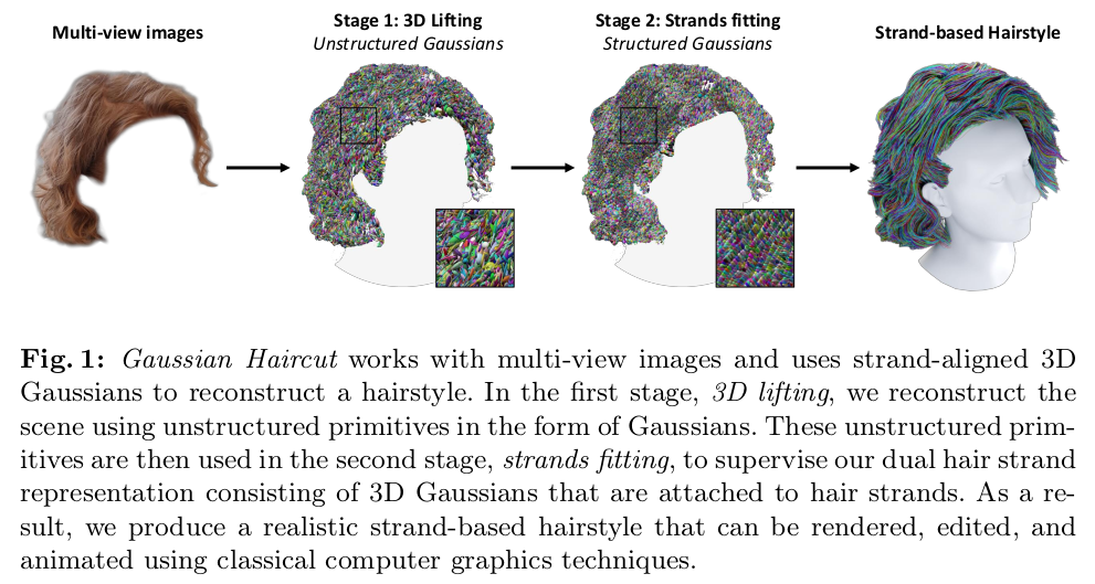 이 논문 역시 hair 복원을 목적으로 하는데, neural strand에서 한 스텝 더 나아가서 gaussian을 binding해서 realistic rendering까지 나아간 논문이다. 어떻게 보면 당연한 수순을 밟아 나온 논문이라고 볼 수 있겠다. neural strands에서 아쉬운 점이라고 하면 최종 렌더링 결과를 얻는 것이 alpha compositing에 의존하기 때문에 정해진 시점, 입력 시점에서만 결과를 얻을 수 있다는 점이다. Gaussian이 등장한 이후로 시점을 다양화하는 것은 기본처럼 느껴지게 된 상황이라 마지막 렌더러를 GS로 바꾸려고 생각하는 것은 자연스러웠다.