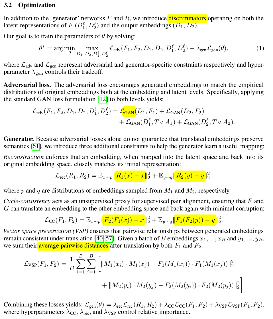 핵심은 GAN loss 1) 1->2 , 2->1로 mapping된 embedding을 discriminator에 던져 주면서 true false 학습 2) 1->universal->1 ,2->universal->2 원상 복구했을 때 그대로 이도록 학습 3) 1->2->1 2->1->2 도 그대로 이도록 cyclic 학습 4) 변환 전, 변환 후 cosine similarity가 같도록 embedding space 상 거리가 비슷하도록 학습 |