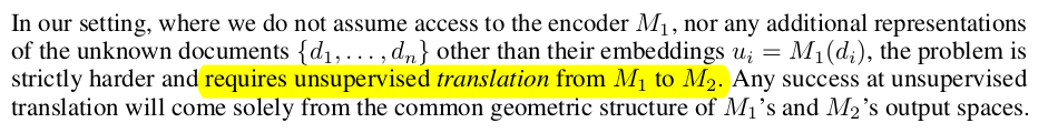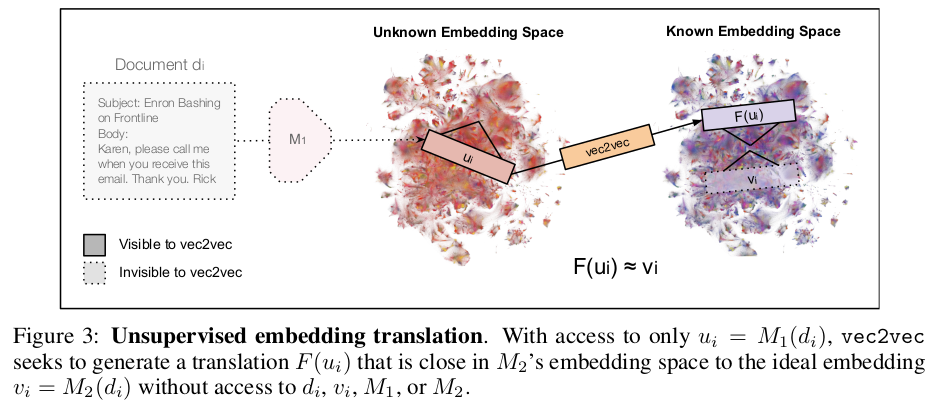 멋지지만 동시에 두렵다;; embedding은 암묵적으로 human interpretable이 아니기 때문에 유출이 된다 한들 대응되는 decoder 모델에 접근이 불가능할 경우 완전암호화나 다를 바 없었다. 하지만 embedding 번역이 가능해진 순간, 심지어 unsupervsed 방식으로, embedding을 유출시킬 수만 있으면 아무 모델 decoder로도 데이터 원상복구가 가능해진다는 것인데 해킹 시에 큰 문제가 될 수 있을 것 같다.