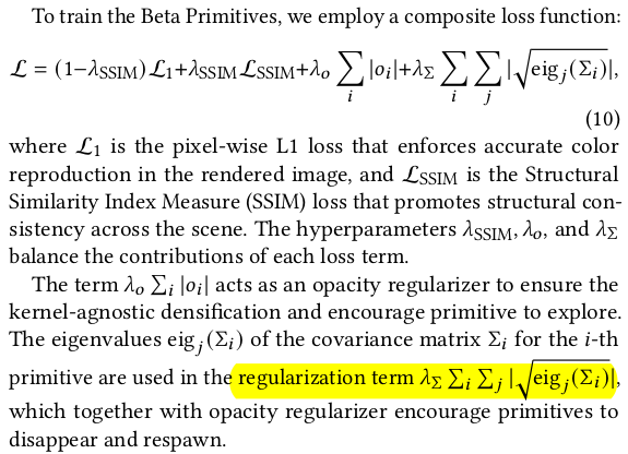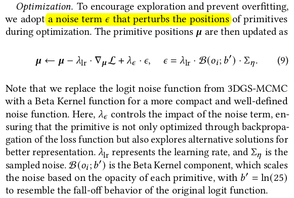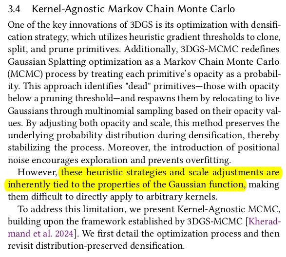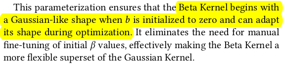 증명까지 이해한 것은 아니라서 이유는 모르겠다만, 단순히 opacity를 기준으로 (beta 는 무시한 채) densification, pruning을 똑같이 진행해도 수학적으로 보면 전체 point 분포가 유사하다는 점. 다시 말하면, 어떤 beta kernel이든지 전체 point 분포는 결국 비슷하게 되므로, 그냥 opacity 기준으로 densification/pruning해도 된다는 듯. |