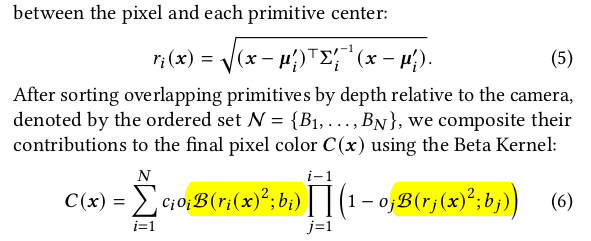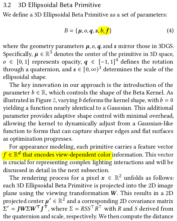 이미지 픽셀로 렌더링할 때는 3차원 분포이다 보니, 3DGS랑 동일한 수식 적용이 가능하다. ([0,1] bounded 값이니 scale을 이해하기 더 직관적인 장점도 있음) position, scale 갖고 하나의 point가 몇 픽셀에 걸쳐 렌더링 되는지 계산한 뒤, color를 칠할 때 beta kernel을 반영해서 색상을 칠하면 된다. (gs일때는 -inf to inf였기 때문에 scale도 범위에 영향을 주고 gs도 영향을 줬었음, aliasing artifact 생김) -------- c를 어떻게 계산하는지는 후술한다. |