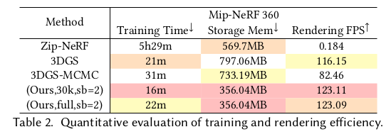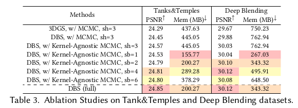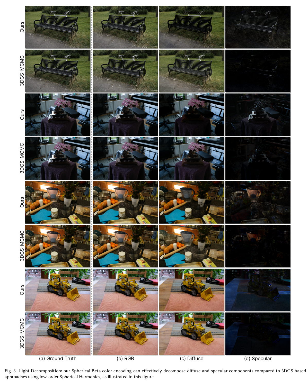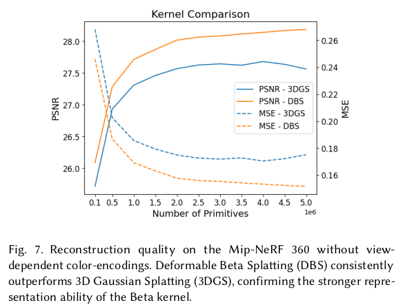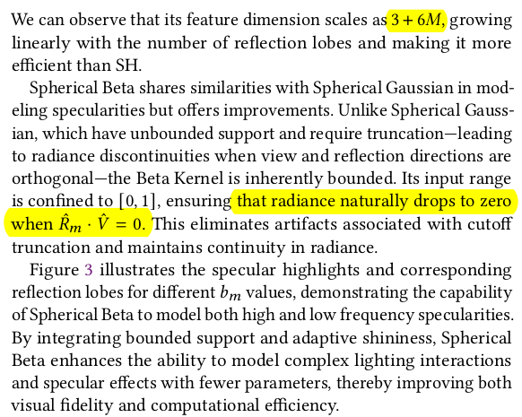 동시에 Beta kernel을 사용하면 SH도 교체가 가능하다는 점도 보여줬다. 결과적으로 표현력을 끌어올리는 것 뿐만 아니라 SH를 대체함으로써 용량 축소까지도 할 수 있다.