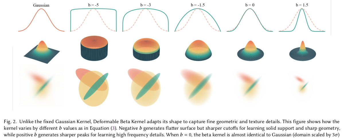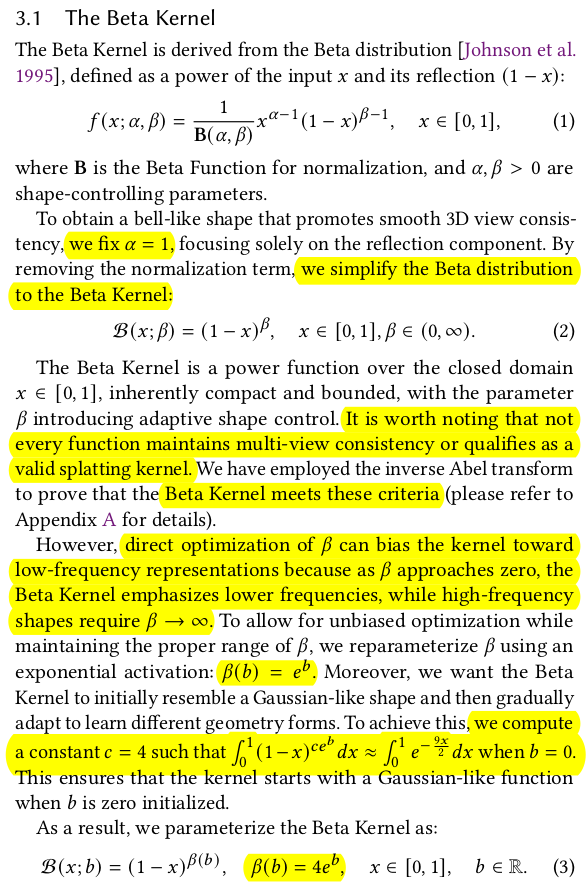 ![]() beta distribution은 본래 위 예시처럼 alpha, beta에 따라 모양이 결정되는 [0,1] bounded distribution 중 하나인데, 보다 시피 분포 모양의 자유도가 매우 높다. 한쪽으로 치우친 것, 뒤집힌 것, 종 모양 등등 저자들은 Gaussina distribution 대신 beta distribution을 선택했고 (그냥 선택한게 아니라 수학적으로 이게 정리가 되기 때문에 선택한 것) splatting이 되도록 이론을 정리했다. --- 먼저 뒤집힌 모양처럼 너무 극단적인 변형은 필요가 없으므로 alpha를 1로 고정하고 beta 만 조절할 수 있도록 제한했다. (위 그림 처럼 제한된 변형이 가능) 그리고 각 primitive에 beta를 추가했다. 이 때 그냥 b 로 넣으면 [0, inf) 범위 내에서 최적화해야 하므로 안정성이 떨어져서 beta = exp(b)로 한번 wrapping하고 primitive에는 b가 들어가도록 했다. 추가적으로 초기 모양이 GS랑 유사한게 평균적으로 좋긴 하니까 앞에 constant를 4 로 지정해서 GS랑 최고로 유사한 초기 beta distribution으로 시작할 수 있도록 했다. |