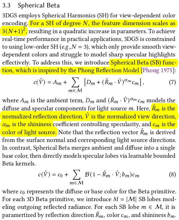 ![]() c를 계산하는건 SH를 대신할 SB를 제안한다. beta kernel에 곱해져서 최종 색상을 만드는 방식이라 spherical beta라고 이름 붙인 듯 하다. 수식(7)과 같이 색상 = 기본 색상 + M개의 (diffuse + view dependent specular) 로 정의하는 방식을 선택했는데, 그 이유가 위 형태는 beta kernel로 재정의 될 수 있기 때문이다. 수식(8)처럼 다시 말하면 위와 같이 정리하면 beta kernel에 곱해서 최종 색을 만들어 낼 각각의 색상도 beta kernel의 coefficient를 통해 계산이 가능한 것. 일타이피 인것. view dependent color를 표현하기 위해서 별도의 추가 개념 없이 앞서 추가했던 beta kernel을 그대로 쓰면 되니까 문제가 간단해진다. SH 버리기 가능. ----- 여기서 M은 hyper parameter다. 기본색상에 더불어서 몇개의 자유도로 색상을 보강할 것인지 사용자가 정하면 된다. 예를 들어 M=2로 하면, 기본 색상 2개에 더불어서 2방향 specular가 더 있을 것이라고 가정하고 수렴시키는 것과 같다. 앞에 primitive에 b와 더불어 추가했던 새로운 f가 3+6M의 feature vector인데 3이 기본 색상, 6M이 diffuse + specular이다. 최적화 되면서 알아서 방향과 색상이 수렴한다. |