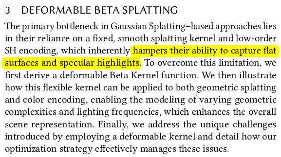 3DGS가 혁신적인 것은 인정하나, 그 근본적인 원리를 생각해보면 Gaussian 갖고 모든 형상을 표현해야 되다 보니 평평하거나 날카로운 형상을 표현하는데 한계가 있고, SH를 사용하는 방식도 order에 따라 quadratic으로 계수가 늘어나서 real time 렌더링을 위해 성능을 타협해야 되는 문제가 있다. -> Gaussian 보다 모양이 다양한 kernel을 쓰고 -> SH를 대체할 수 있다면? == DBS다. |