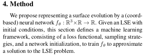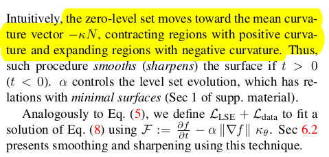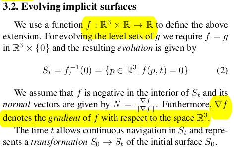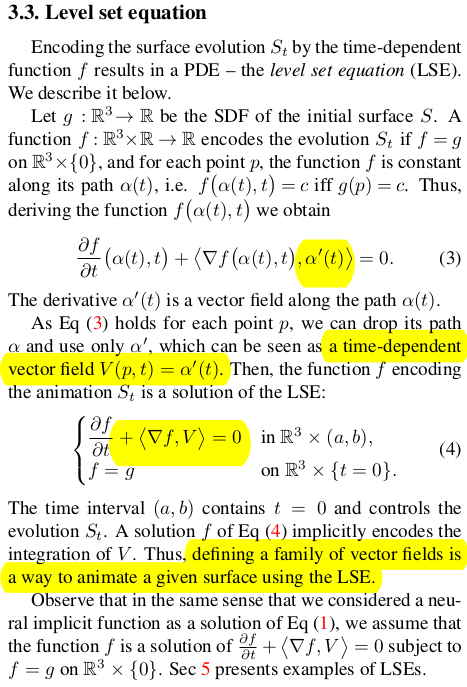 implicit function, g의 변형, 즉 f를 학습시킬 때 f가 중구난방으로 학습하지 않도록 억제하는 억제기는 level set equation, LSE다. 시간에 따라 f가 smooth하게 변형되려면 자연스럽게 편미분 방정식을 만족해야 한다. 어떤 한 점 x가 있을 떄 얘가 변화 과정에서 그리는 경로 a(t)가 있다고 해보자. x는 변형 전이나 후나, 표면에서 떨어진 거리는 같은 것이 이상적인 것이다. 다시 말하면 원래 형상에서 크게 벗어나지 않도록 형상과 같이 움직여서 SDF가 일정하게 움직이는 것이 이상적일 것. "함수값은 시간 흐름 속에서 보존되며 변형된다" -> 이 말을 수식으로 쓰면 수식(3)과 같이 적을 수 있다. 원래는 df/dt =0 인데 f가 공간과 시간 2개의 파라미터가 있으므로 편미분 형태로 chain rule로 분해하면 수식(3)이 됨. 의미하는 건 시간에 따른 변화량이 0이라는 가정. ----- 이 가정을 유지하도록 강제하면 f에 의해 변형이 일어나도 기존 g SDF를 최대한 유지하도록 강제된다. ------ 예시에서 사용한 경로 alpha는 수식 상에서 a(t) == p, 로 대체되므로 a'만 사용되는데 경로의 미분값은 공간상의 변화량이므로 "특정 벡터"로 치환할 수 있다. 예를 들면, 외력, normal vector 등 |