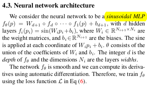 구체적으로 구현할 때는 공간에서 N개의 point p를 뽑고 이걸 query로 던져주면서 minibatch 학습을 한다. 부수적으로 f가 sdf function이니까 eikonal regularization을 넣어주고, div(f)가 normal하고 같도록 해주는 regularization도 추가해준다. ![]() 네트워크 구조는 앞서 MLP를 쓴다고 했는데 SIREN으로 썼다. |