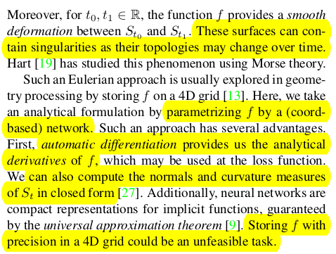 우리가 SDF implicit function 같은 걸로 어떤 형상을 표현하는 방법은 NeRF, IDR, NeuS 등 radiance field 논문들이 등장하면서 흔해졌다. 3차원 vertex가 query로 주어졌을 때 이에 대응되는 SDF 값을 뱉는 구조로 R3->R1로 가는 function, g가 여기서 그 예시다. ---- 우리 목적은 근데 학습 완료된 g의 변형이므로 시간 축이 하나가 더 필요하다. 따라서 주어진 g를 기본으로 깔고 g == f(t=0) 3차원 vertex + 시간 t 가 query로 주어졌을 때 sdf로 가는 R4->R1 구조의 f를 학습시키는 것이 본 목표다. 이 때 f에게 무한히 많은 t에 대해서 변형 중간 과정을 다 보여주면서 학습하는 것은 불가능하기 때문에 discrete한 시간을 보여주고 중간중간은 합리적으로 배울 수 있도록 억제하는 무언가를 추가한게 이 논문의 핵심. |