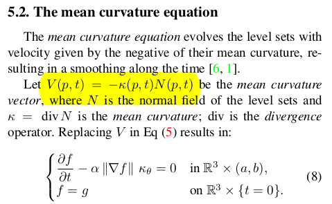 V가 외력 vector일 경우, 예를 들면 머리 부분에는 압력, 몸통 부분에는 팽창하는 힘이 작용하는 vector field안에 있다고 생각해보면 됨 그러면 F에 작용했던 <div(f), a'>을 외력으로 바꿔주면 됨. data term은 g0 초기 SDF function 밖에 없으므로 f0가 그거랑 유사하도록 하는 것 밖에 못함. 이렇게 하면 주어진 외력에서 형상이 smooth하게 변형되는 것을 볼 수 있음 물론 무한히 외력이 작용하기 때문에 계속 반복하면 형상이 깨진다. 특정 iteration에서 사람이 멈춰줘야 함. |