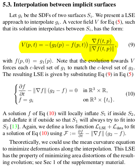 이게 내가 볼 땐 제일 핵심인데 g0와 g1가 존재할 때 둘 간의 interpolation은 어떻게 할까 point, p에 대해서 g0 g1 sdf gt가 있기 때문에 이걸 갖고 학습해주면 됨. sdf가 거리 개념이기도 하니까 수식9와 같이 sdf간의 차이가 변형 크기를 의미할 수 있음 여기다가 div(f)를 곱해주면 방향이 생기니까 그대로 외력과 같아짐 |
