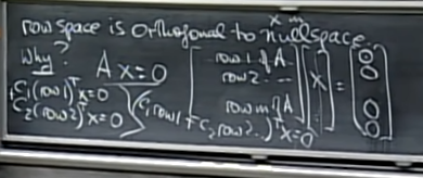 - 즉, row of A와 null space x는 dot product 결과로 0을 만들어내게 되는데 이는 서로 수직함을 의미한다.
