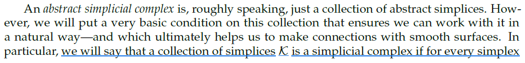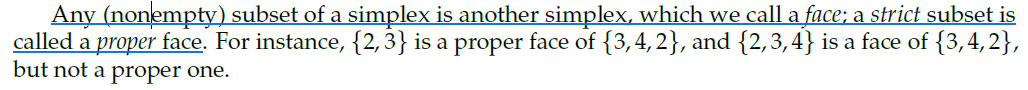 조금 헷갈릴만한 용어도 있다. 바로 face다. face는 vertex 3개가 이루는 삼각형이라고 생각할 수 있는데 위상수학에서는, 어떤 simplex가 있을 때, 이 원소들로 만들어진 또다른 부분집합 simplex 을 말한다. (자기 자신은 제외) |
