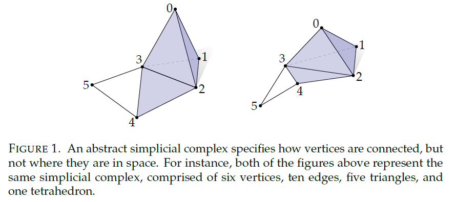 먼저 differential geometry에서는 흔히 mesh로 접한 vertex-edge-face로 구성된 구조물을 다룬다. vertex와 그 간 connectivity가 주요 정보가 되겠다. vertex : 0-simplex edge : 1-simplex face : 2-simplex가 라는 용어로 정의된다. k-simplicies 자체의 정의는 "right next to each-other" 즉 거리가 1로 맞닿아있는 상태의 topology들을 말한다. simplicial complex는 다수의 simplices로 구성된, 부분집합의 그룹이다. 앞에 abstract가 주로 붙는데 이건 연결 관계만 집중할 뿐 실제 거리 개념은 상관이 없기 때문이다. 옆 그림에서 2개는 같은 것이다 위상수학에선. |