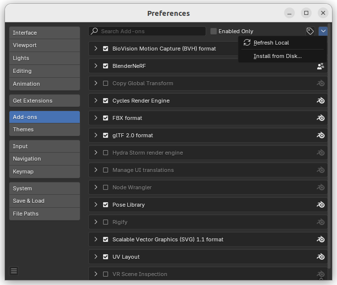 - Blender를 켜고 Edit > Preferences > Add-ons 에 들어가 Install From Disk 선택
