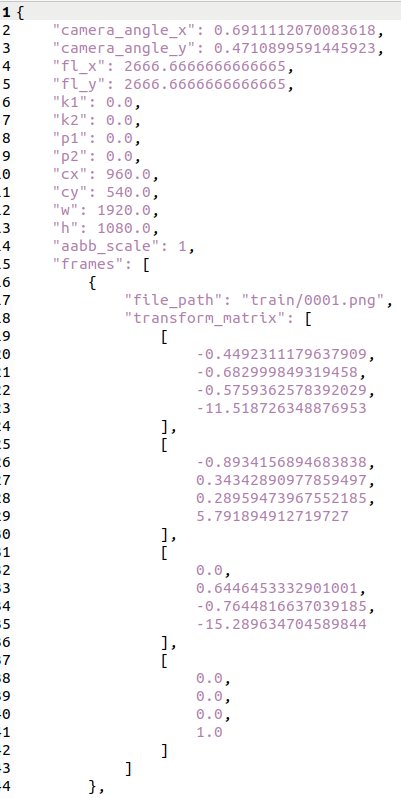 transforms.json을 열어보면 카메라 포즈가 생성했던 반경 radius에 맞춰져있기 때문에 굉장히 큰 것을 볼 수 있다.