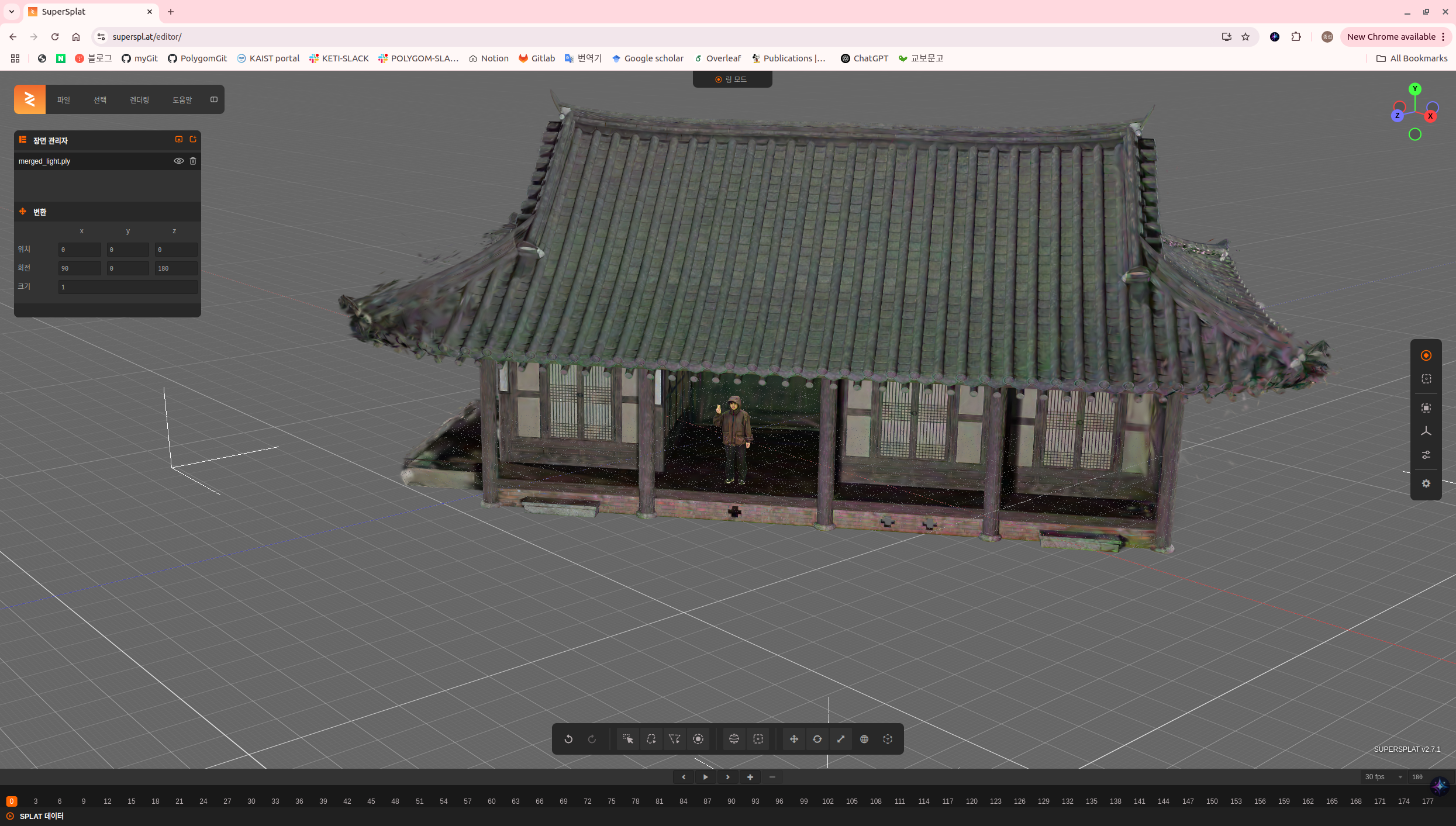 nerfstudio splatfacto를 이용해 결과 진짜 깔끔하게 잘 만들어지고 (카메라 포즈가 100% 정확하니까) supersplat에 불러와서 다른 3DGS랑 합쳐버리면 위와 같이 최종 결과물을 낼 수 있다.