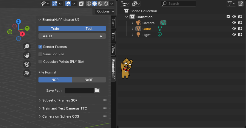 위 과정을 따르면 우측 상단에 세로바를 < 눌러서 열어 보면 BlenderNeRF 플러그인이 설치된 것을 볼 수 있다.