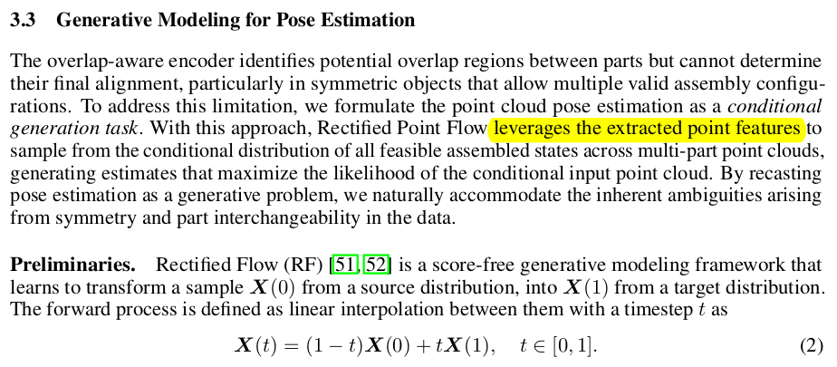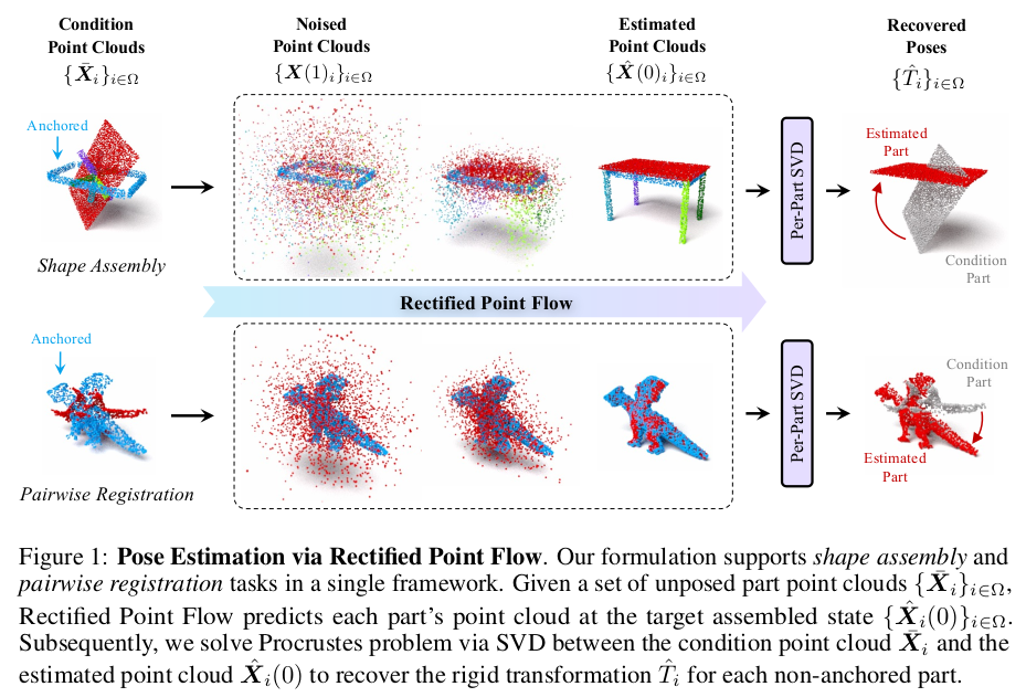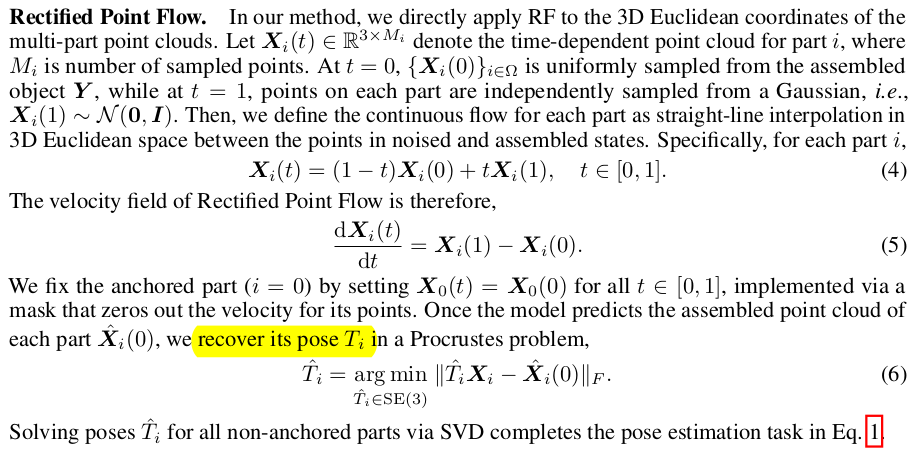 총 3가지 구성이다. 1) self-supervised로 point encoder 학습해두기 2) DiT 학습하기 -> pointcloud 각 point마다 시간 t에 따른 velocity field 추정 3) procrustes alignment로 point cloud 전체 SE3 계산 |