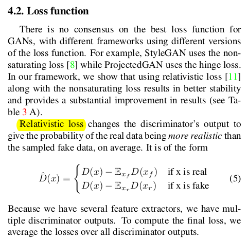 안정적인 학습을 위해 GAN 분야에서 국룰인 R1 regularzation. discriminator에서 발생하는 gradient의 크기를 억제해서 discriminator가 날뛰는 것을 막는 작용인데 fronzen foundation model이 중간에 박혀있으므로 이미지에 대한 gradient가 아닌 feature에 대한 gradient로 바꿔서 사용했다는 점이 차이. |