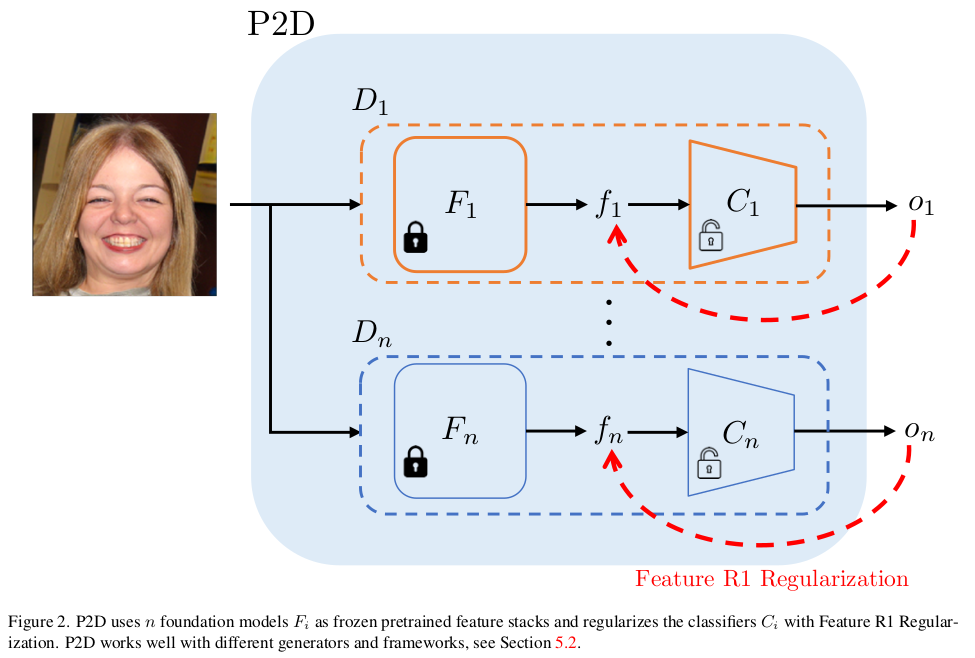 핵심 가정은 foundation model이 갖고 있는 feature extraction 능력은 discriminator 라고 반갑지 않을리 없다는 것. ![]() discriminator 안에 이런 식으로 multiple foundation model을 넣어두고 그 feature를 갖고 discrimination하는 구조로 변경해서 그 효과를 관찰해본다. |
