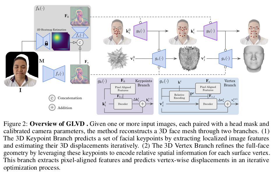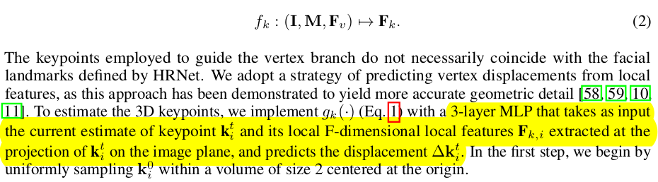 그림만 보고 mesh diffusion 같은 컨셉인 줄 알았는데 알고보니 LVD의 얼굴 버전이더라. 단순히 말하면 LVD랑 똑같이 projected vertex 위치에서 이미지 feature를 뽑아가면서 vertex 위치의 보정량을 예측하는 네트워크를 학습하는 건데, 얼굴이라는 도메인을 살려서 keypoint 에 대해서 relative postiion encoding을 취하면서 진행하면 성능이 좋다는 얘기.
