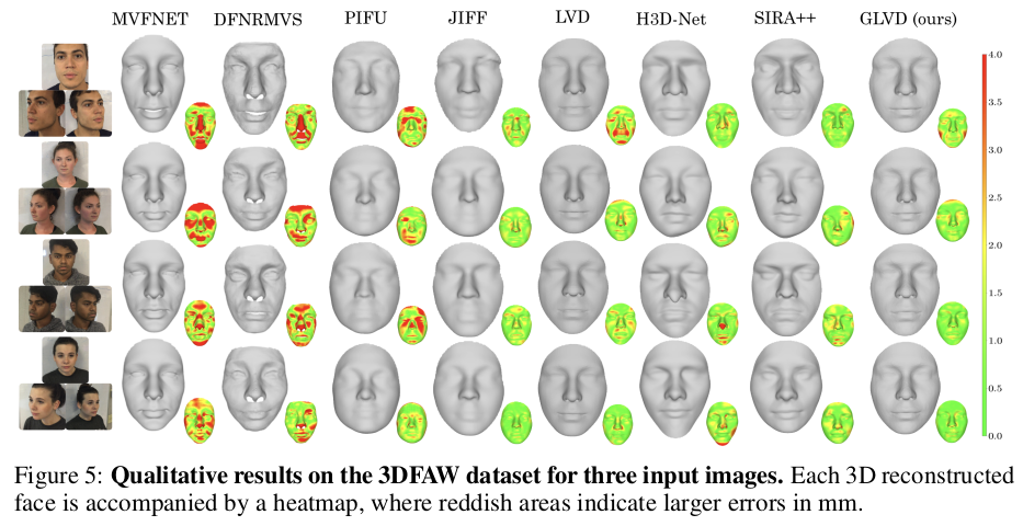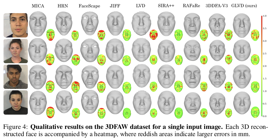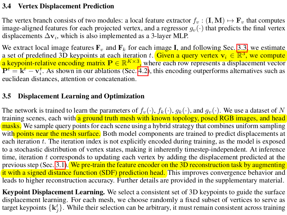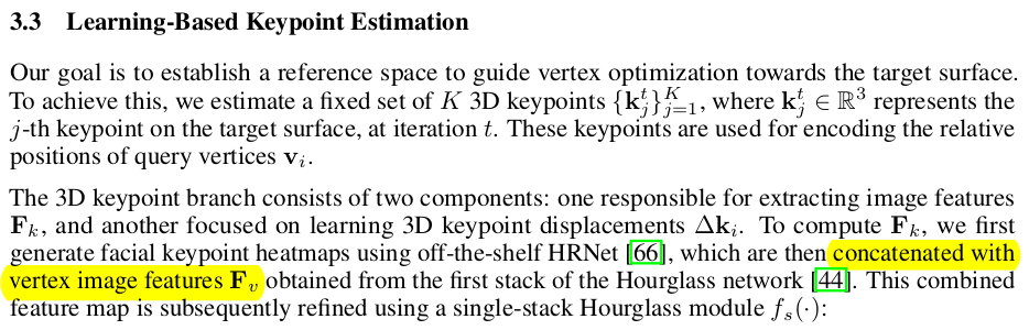 그림만 보고 mesh diffusion 같은 컨셉인 줄 알았는데 알고보니 LVD의 얼굴 버전이더라. 단순히 말하면 LVD랑 똑같이 projected vertex 위치에서 이미지 feature를 뽑아가면서 vertex 위치의 보정량을 예측하는 네트워크를 학습하는 건데, 얼굴이라는 도메인을 살려서 keypoint 에 대해서 relative postiion encoding을 취하면서 진행하면 성능이 좋다는 얘기.