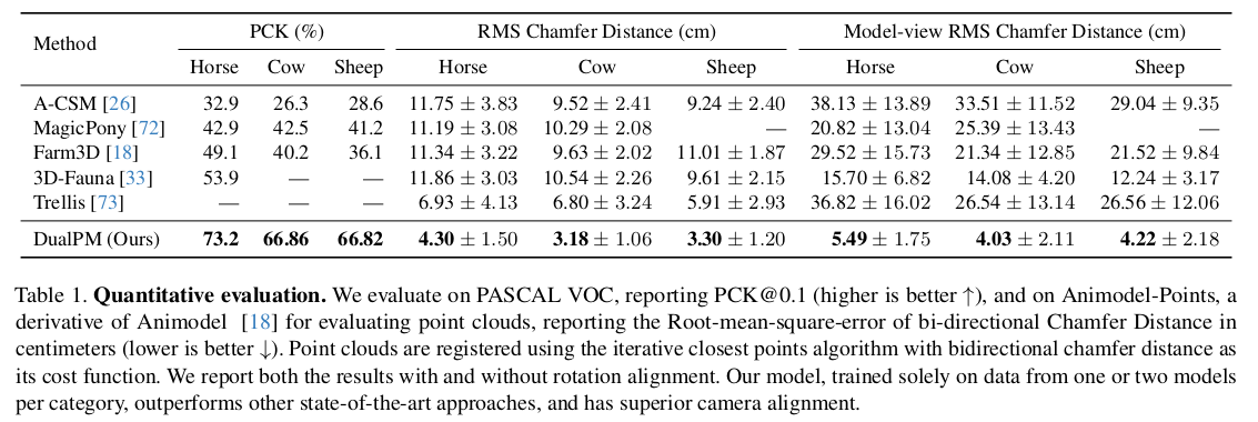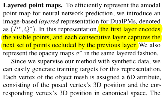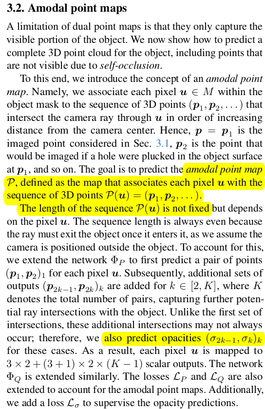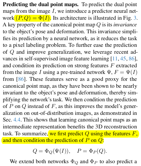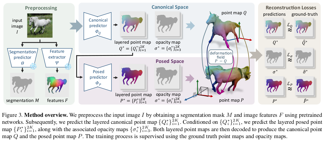 DINOv2 feature로 시작해서, 픽셀 별로 canonical point 먼저 예측하고, 이게 다시 입력으로 들어가서 deformed point를 예측하게되는 순서. 이 때 visible point만 하는게 아니라 occluded point도 다루고 싶어했기 대문에 point를 2N개 예측하도록 했다. (2N인 이유는 들어갔다 나왔다. surface에 2번 부딪힌다는 가정이기 때문) |