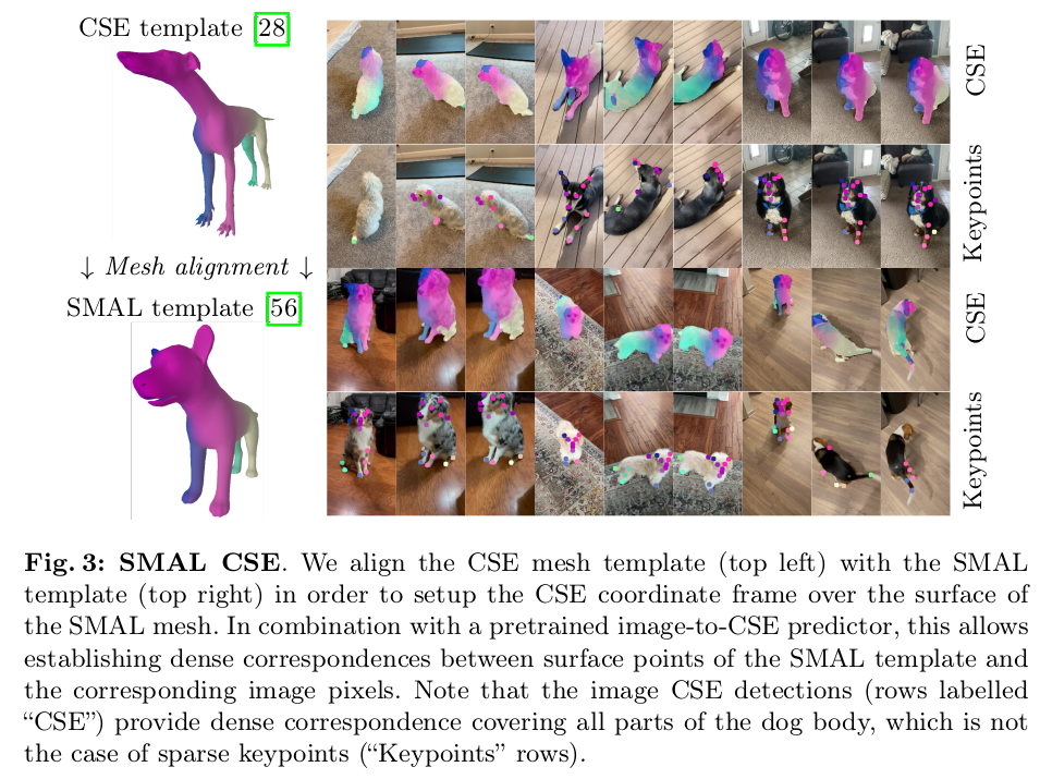 좋은 논문의 활용은 시간이 지나도 빛이 바래지 않는다. CSE 재등장.. 아무도 관심 갖지 않았던 CSE표현법의 장점. topology matching만 된다면 꼭 사람이 아닌 형상에 대해서도 surface embedding을 만들 수 있다는 장점. 고로 CSE 동물 버전이 존재하는데, 이걸 가져와서 입력 정보로 같이 썼다. (테스트 해보니, 모든 프레임에 대해서 성공할 정도로 안정성이 높진 않다. 개를 위에서 찍거나, 개의 뒤를 찍으면 잘 안된다. 예측 실패한 프레임은 버리는 식으로 처리했음) |
