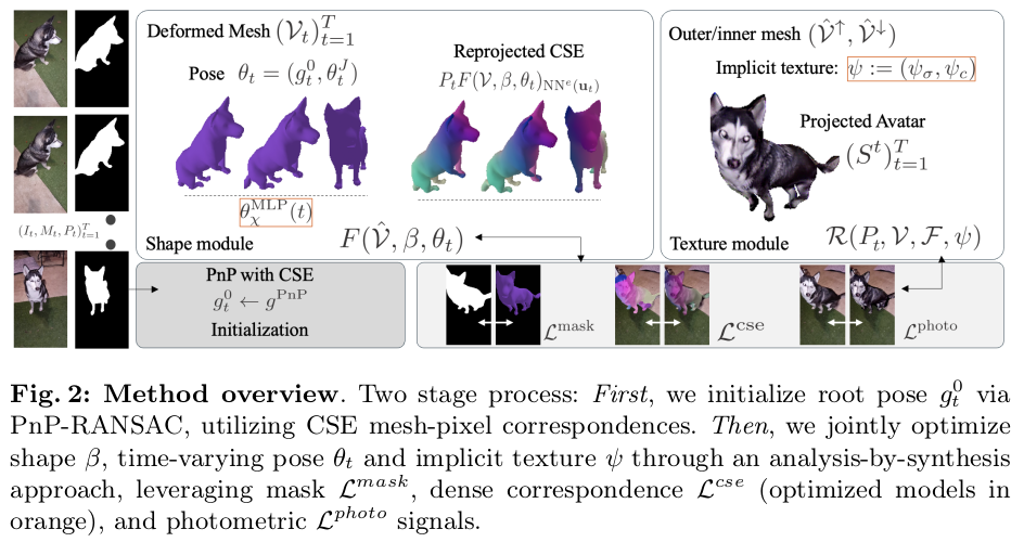 핵심은 CSE가 동물 버전도 있다는 것에서 착안해서 CSE 예측값을 fitting의 pseudo GT로 활용하는 것. + SMAL surface 주변에서 국소 NeRF 렌더링으로 texture를 찾아내는 것이다.