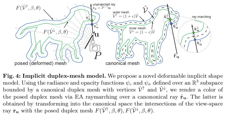 기본적으로 딥러닝이 아니라 최적화 프레임워크다. 이미지 + 카메라 포즈 + 마스크 + CSE 예측 결과가 주어졌다고 했을 때 differential rendering 을 통해 SMAL 파라미터를 역추정하는 것이 1단계 1단계가 완료되었을 때 SMAL surface 살짝 안쪽 살짝 바깥 쪽에 surface를 하나 더 만들어 내고 inner<->outer 사이 공간에서의 짧은 ray 에 대해 raidan field technique을 써서 texture를 찾는다. texture는 고로 NeRF 네트워크가 있어야 됨. texture map이나 vertex color로 찾아지는건 아니다. |