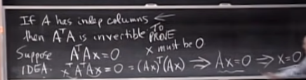 - 따라서 A.TAx = 0의 null space는 역시 zero vector 뿐이고 이는 A.TA 가 invertible, full rank라는 소리다.