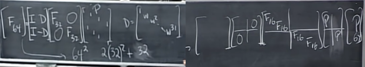 - 좌측사진을 보면 그 구체적인 형태가 나와있는데 F64는 [F32가 대각성분, 나머지는 0] 인 64x64 행렬을 중앙으로 두고 앞에는 [Identity, Diagonal]행렬 뒤에는 [홀수만 뽑는 permutation, 짝수만 뽑는 permutatino] 행렬이 붙은 형태로 표현이 가능하다.