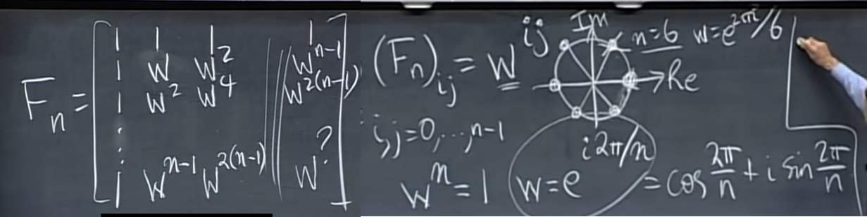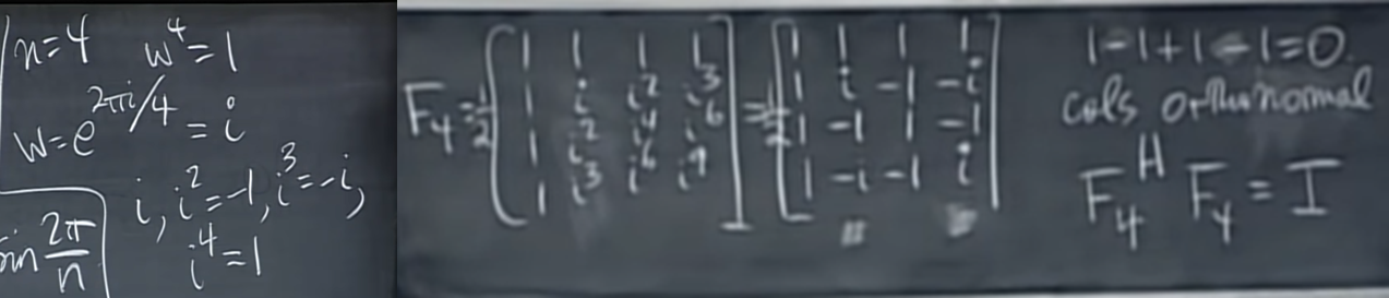 - Fn은 위와 같이 생겼는데 Fn의 i th row, j th column 값 (Fn)ij 는 w^(ij) 이며 그 w는 칠판에 적혀있는 것처럼 exp(i2pi/n)이다.