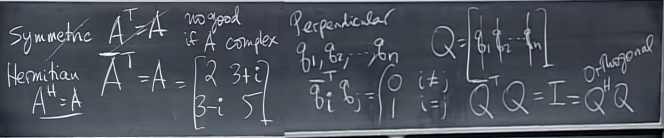 - complex domain에서는 symmetry와 perpendicular의 개념도 바뀐다. symmetry는 hermitian(conjugate+transpose)를이 원본과 같아야 한다. perpendicular 역시 Q.T Q= I 가 아니라 Q.H Q = I 를 만족해야 한다. (그리고 perpendicular가 아니라 unitary라고 부른다.)